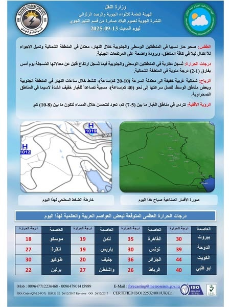 توقعت هيئة الأنواء الجوية، اليوم السبت أن تشهد أجواء البلاد طقساً حاراً في المنطقتين الوسطى والجنوبية خلال ساعات النهار.