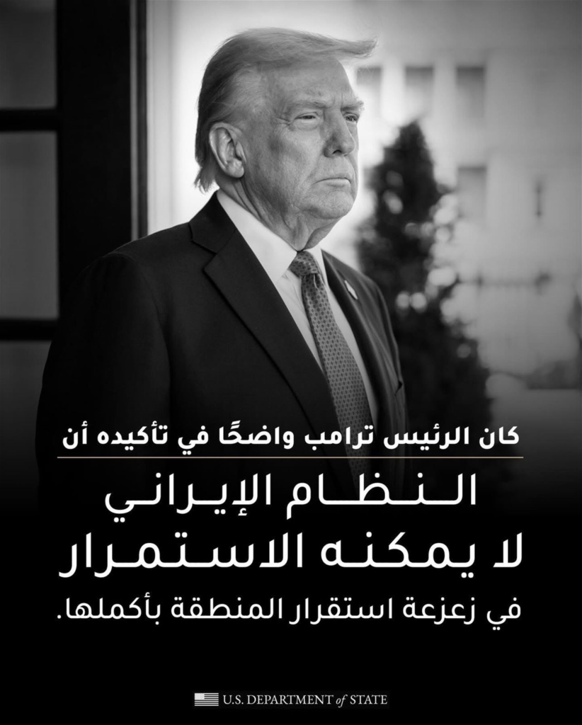 وتضمن منشور السفارة الذي تابعه موقع “إيجاز” صورتين للرئيس ترامب باللغتين العربية والإنكليزية مدونة في داخلها عبارة “كان الرئيس ترامب واضحا في تأكيده ان النظام الإيراني لا يمكنه الاستمرار في زعزعة استقرار المنطقة بأكملها”.
